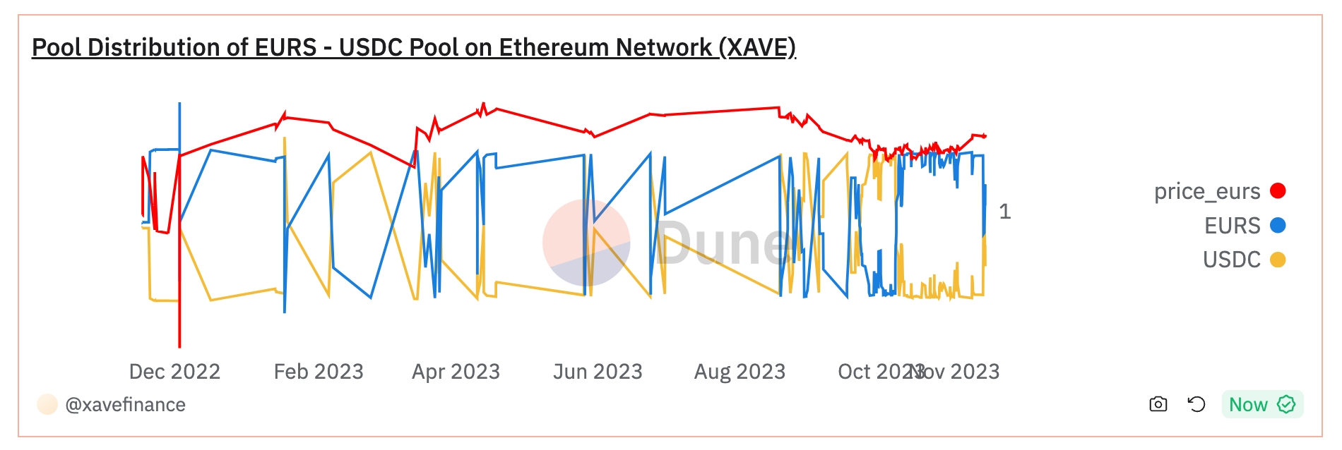 EURS:USDC Ethereum LP Ratio Over Time: https://dune.com/xavefinance/eurs-usdc-pool-ethereum